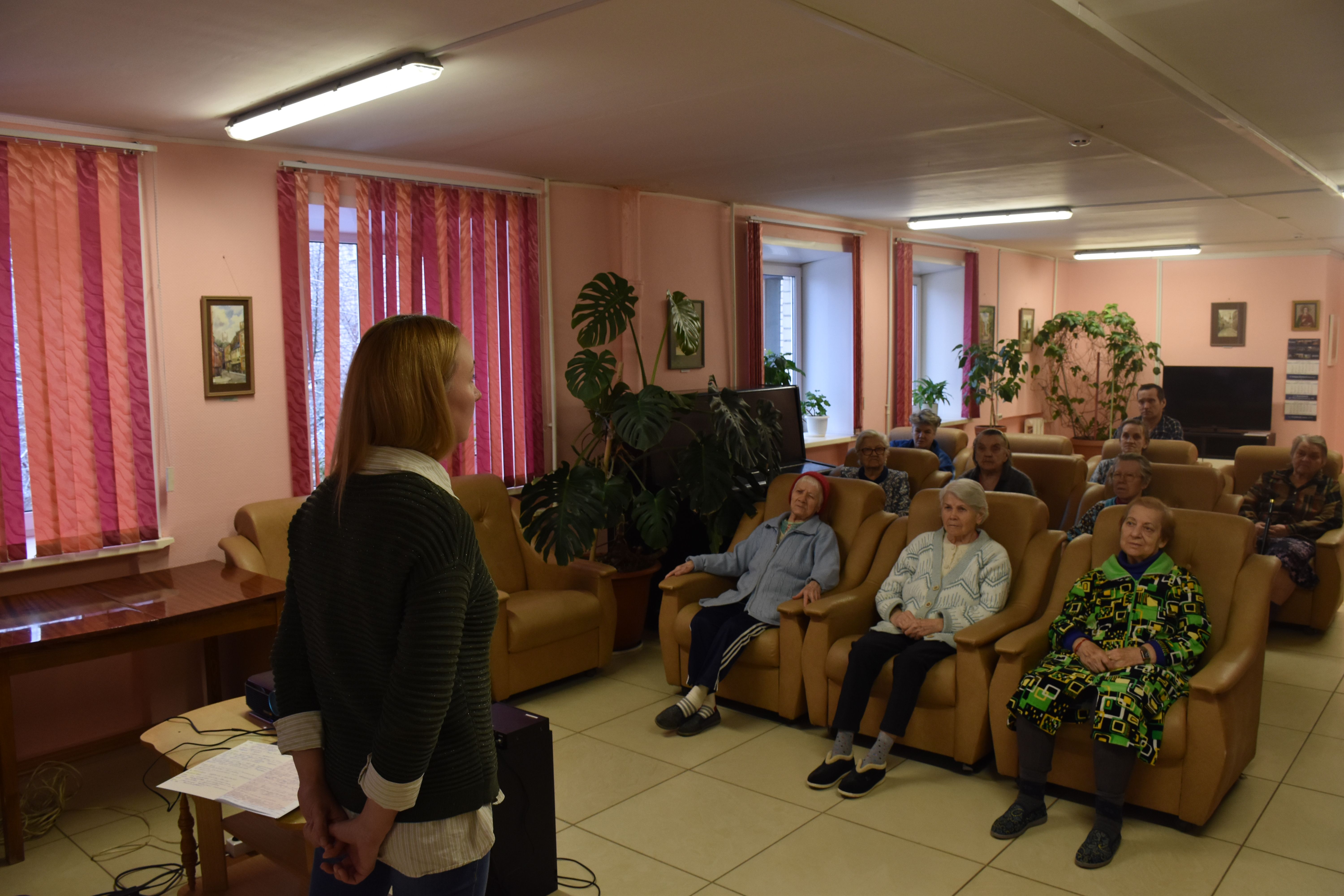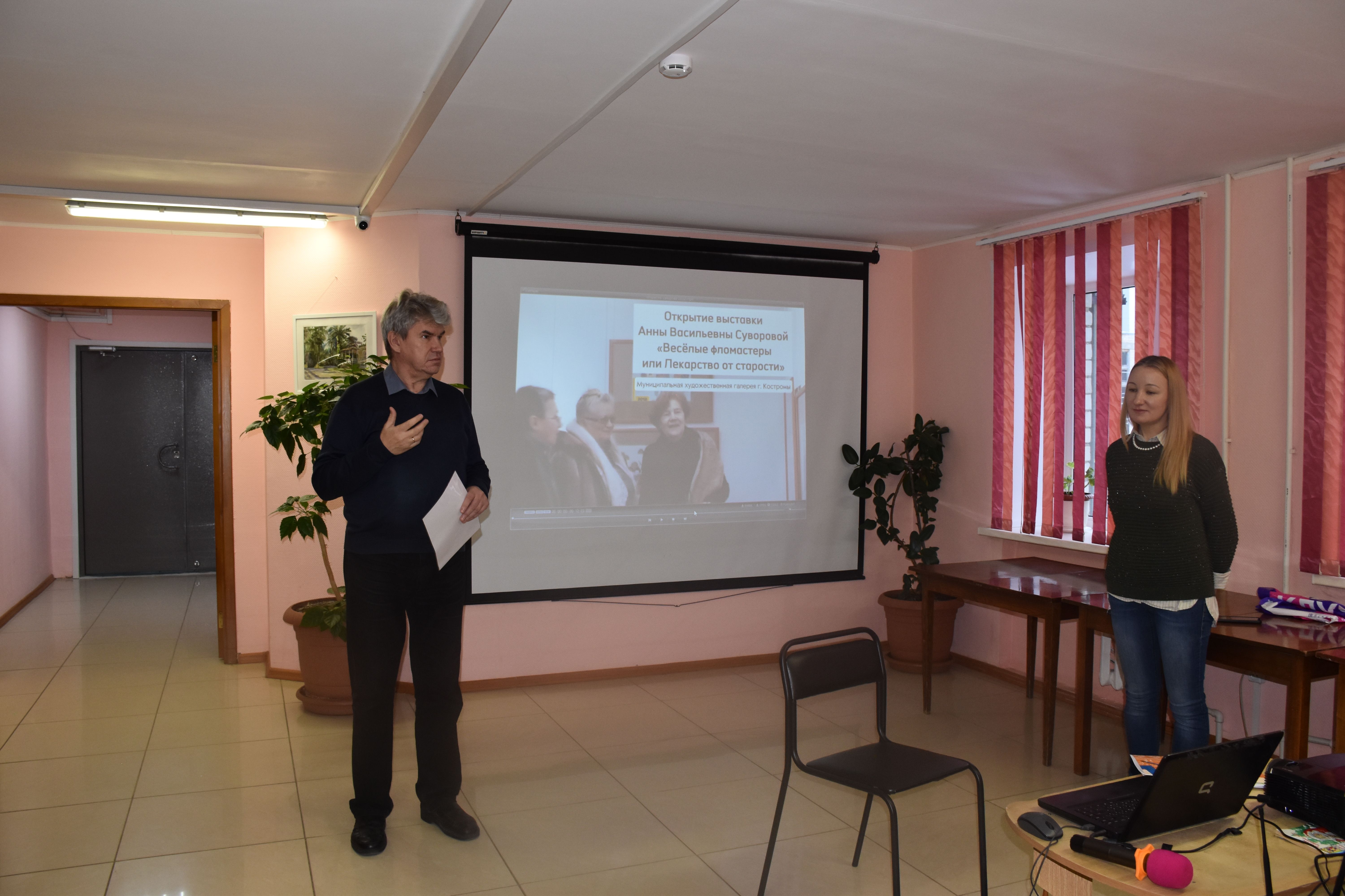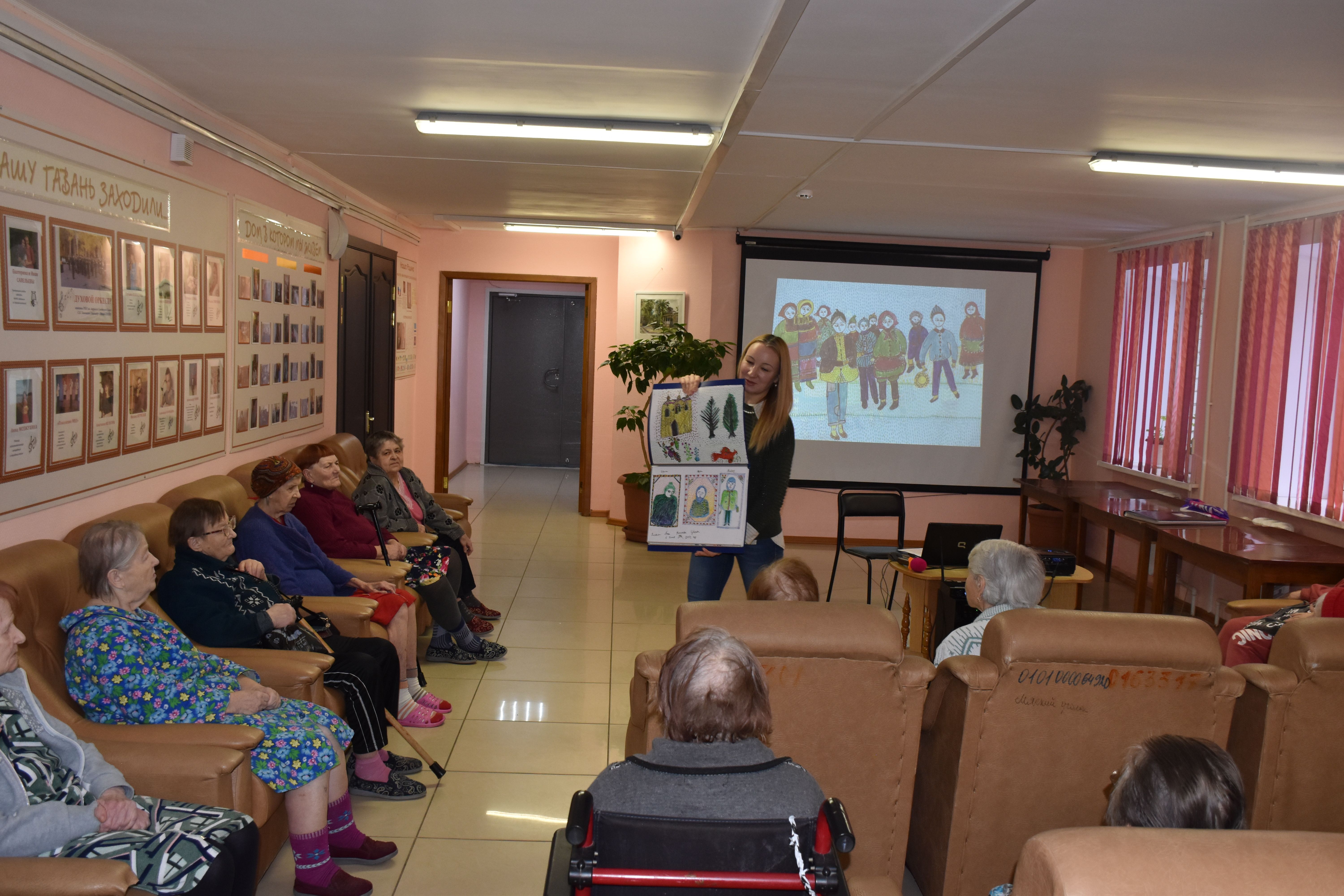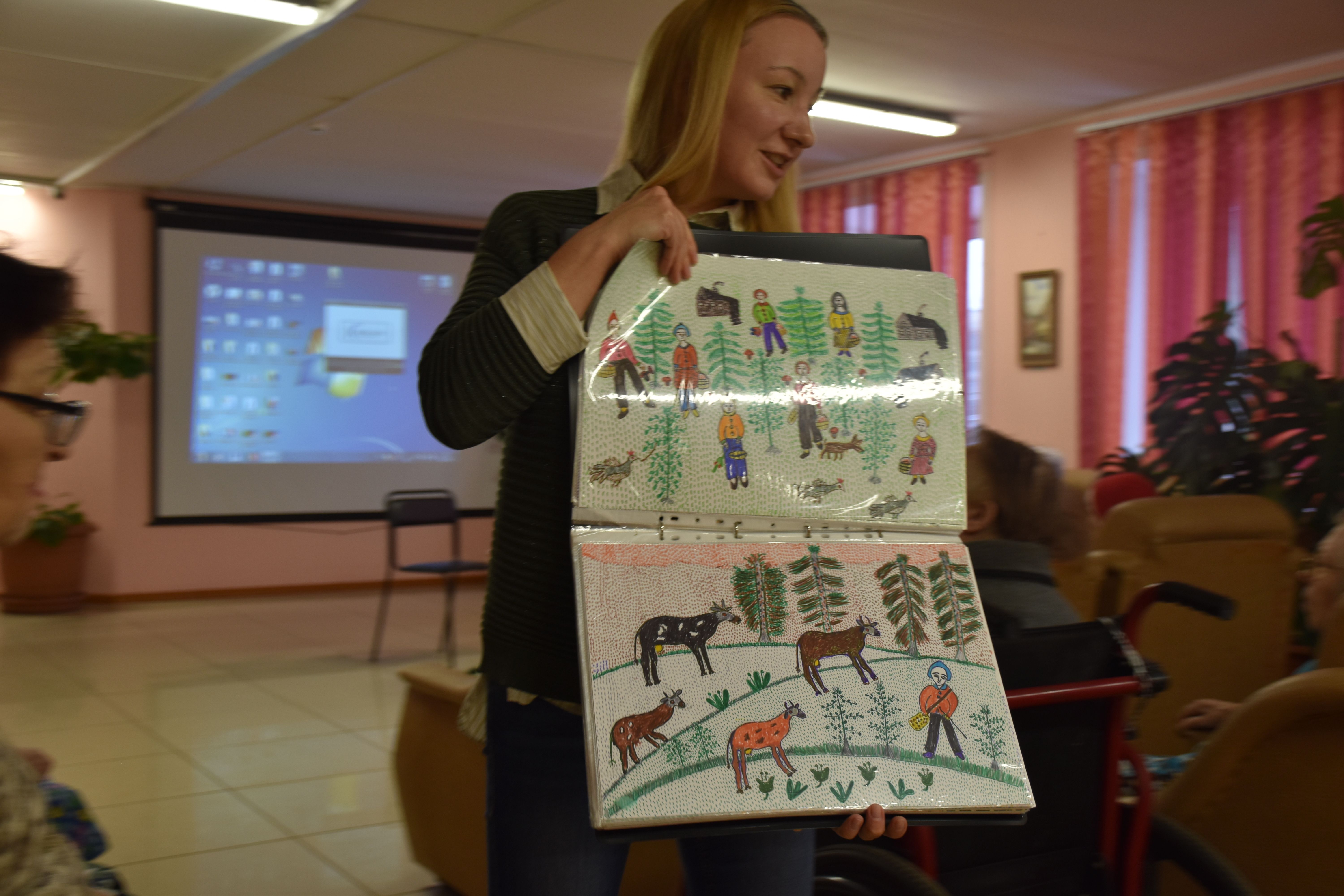 Все получилось так, как, наверно, и должно было получиться, не иначе. В День художника разговор в театральном фойе Октябрьского геронтологического центра зашёл о самобытной костромской художнице Анне Васильевне Суворовой, которая взяла в руки фломастеры в 86 лет, уже будучи прикованной к постели. И за два года своего активного долголетия она оставила потомкам 300 своих рисунков! Юлия не только интересно рассказала о жизни этой удивительной женщины, но и показала собравшимся видеосюжет об открытии выставки её работ "Весёлые фломастеры или Лекарство от старости", а также альбомы с самими работами, что вызвало большой интерес аудитории. Ведь пример Анны Васильевны, сумевшей наполнить свою старость увлекательным занятием, очень поучителен. Главное - не сдаваться, не опускать руки, широко открытыми глазами смотреть на мир и стараться сделать его вокруг себя хоть чуточку радостнее и ярче! Огромное спасибо сотрудниками Центра русского искусства во главе с его директором Верой Павловной Прямиковой. Ждём новых визитов сотрудников к нам в центр и новых приглашений в гости на такие интересные выставки!