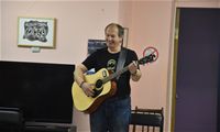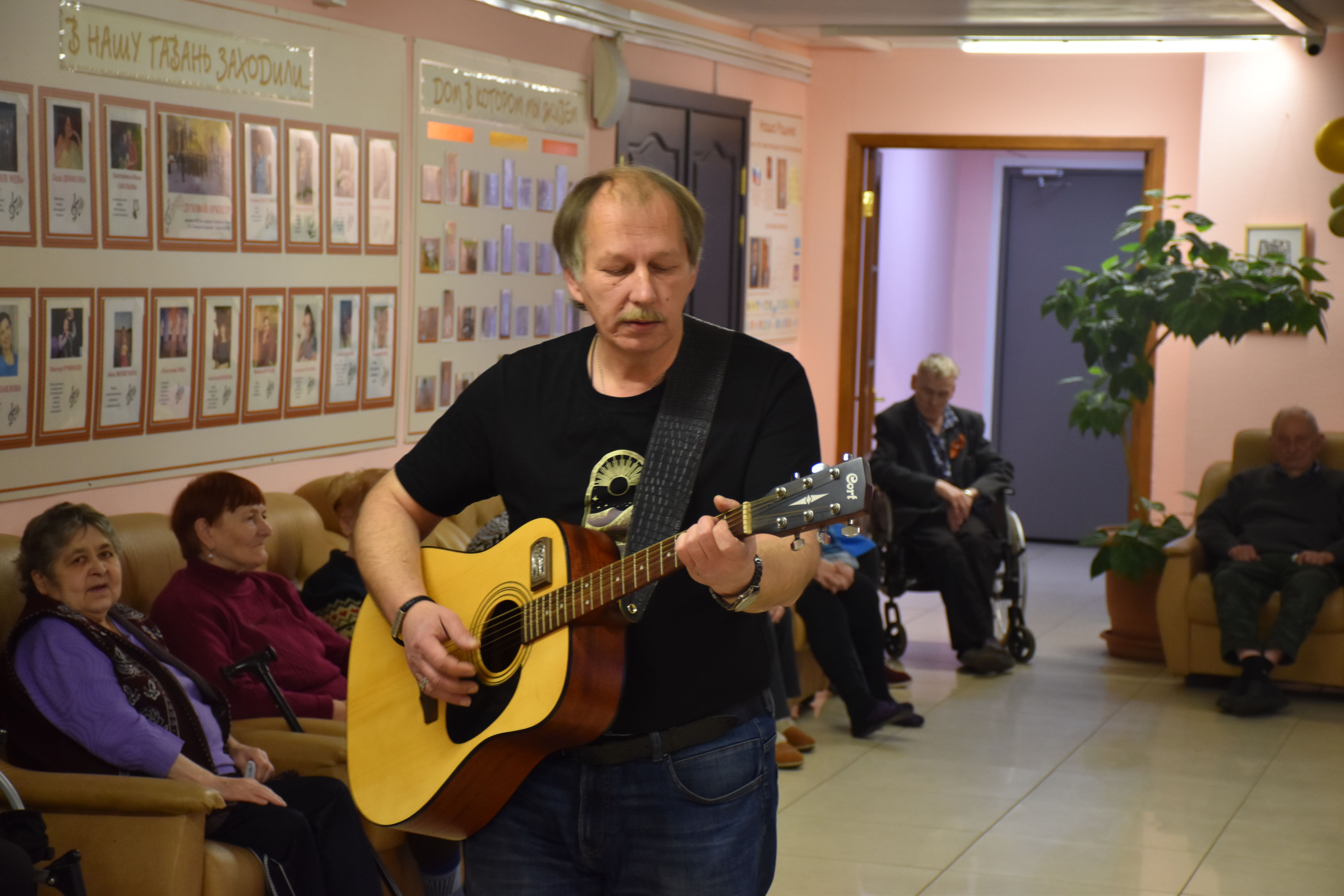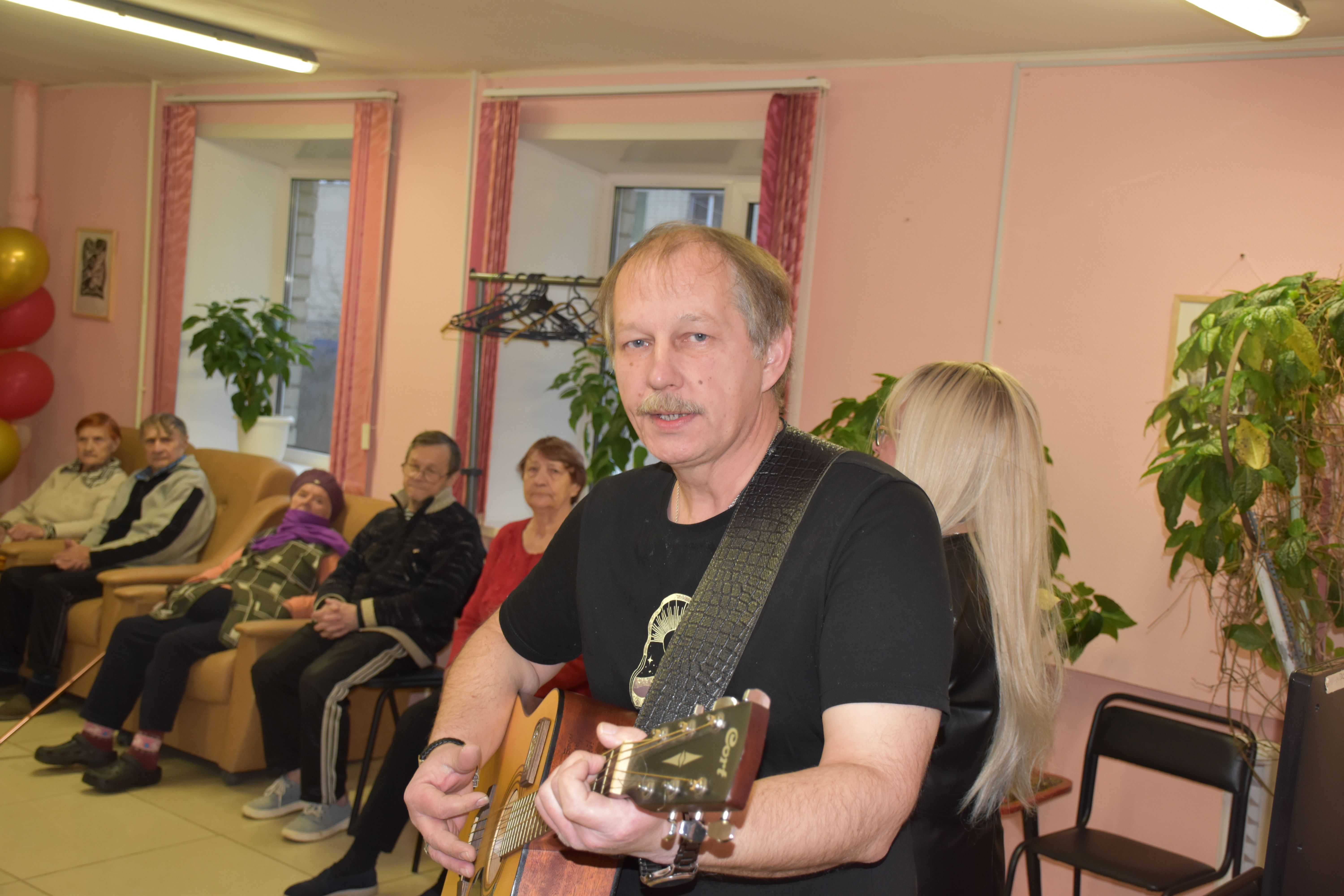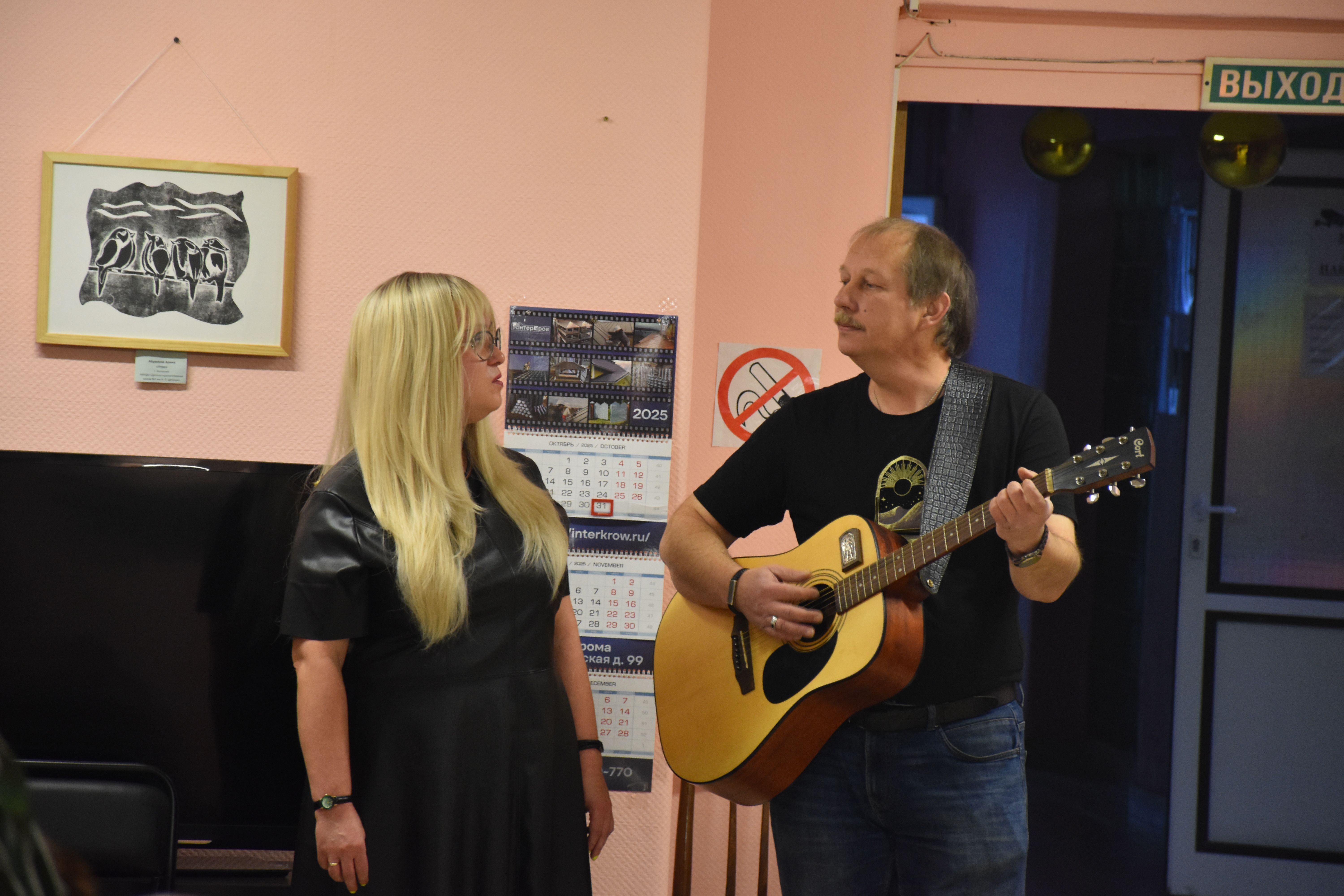 Вместе со своей супругой Екатериной и при поддержке друзей они поздравили всех собравшихся в театральном фойе с праздником, спели несколько авторских песен и пожелали всем бодрости духа, глубокой веры и крепкого здоровья.