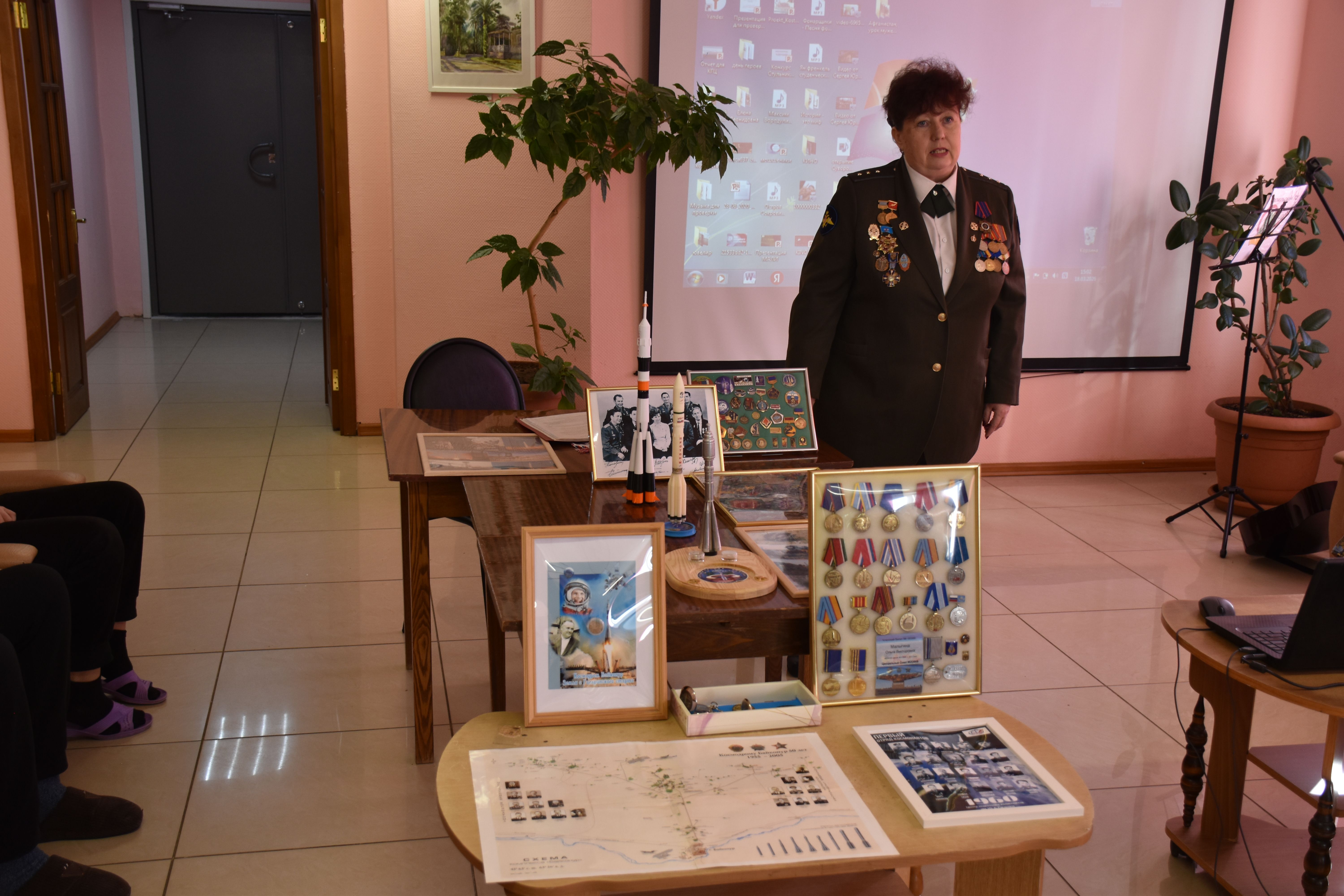 Общение гостьи со зрителями началось задолго до официального начала встречи: Ольга Викторовна привезла с собой большое количество экспонатов и фотографий, которые сразу же заинтересовали постепенно собирающихся в театральном фойе проживающих центра. А сам разговор, точнее рассказ нашей гостьи, был посвящён космодрому Байконур, отметившему в прошлом году своё 70-летие (Ольга Викторовна показала очень содержательный фильм об истории космодрома), Юрию Алексеевичу Гагарину, 65-летие полёта которого в космос мы будем отмечать совсем скоро, 12 апреля. Уважаемая гостья оказалась замечательным рассказчиком, ее выступление вызвало целый ряд заинтересованных вопросов из зала, а наш умелец Александр Александрович Кузнецов в знак признательности подарил ей одну из своих работ. Как сказала сама Ольга Викторовна, сегодня положено начало нашей дружбе, на которую мы, как и она, очень надеемся! С наступающим Днём космонавтики, друзья!