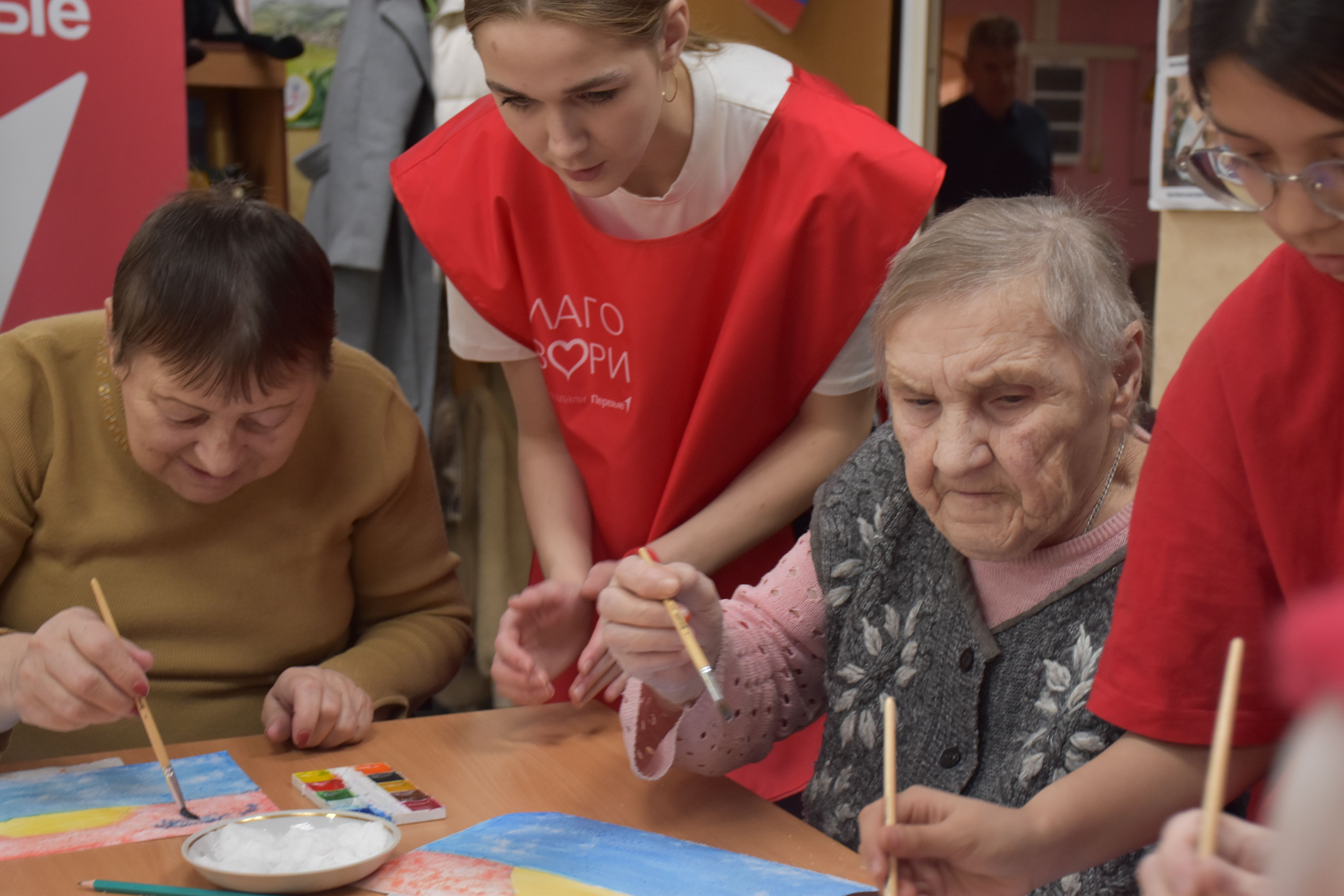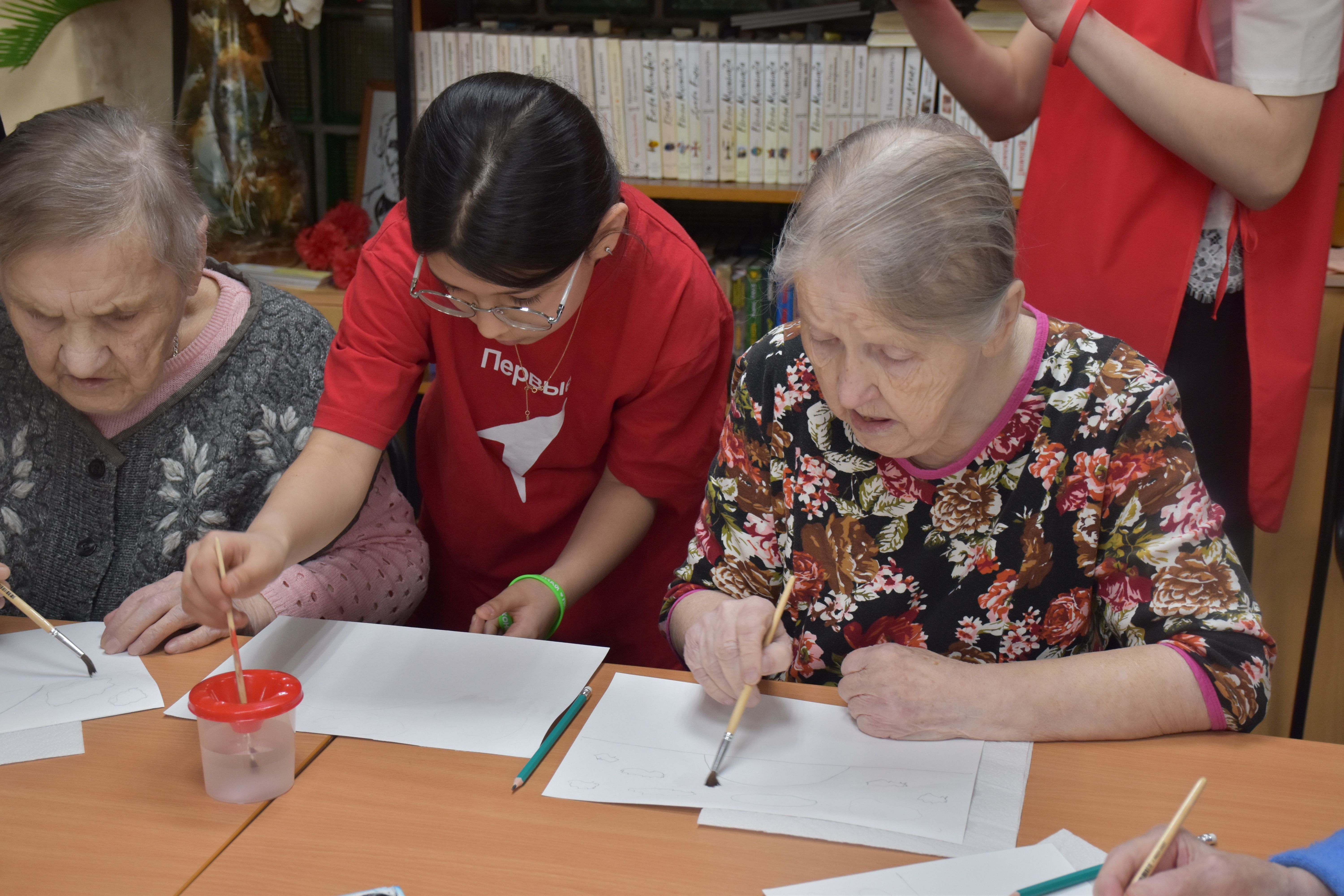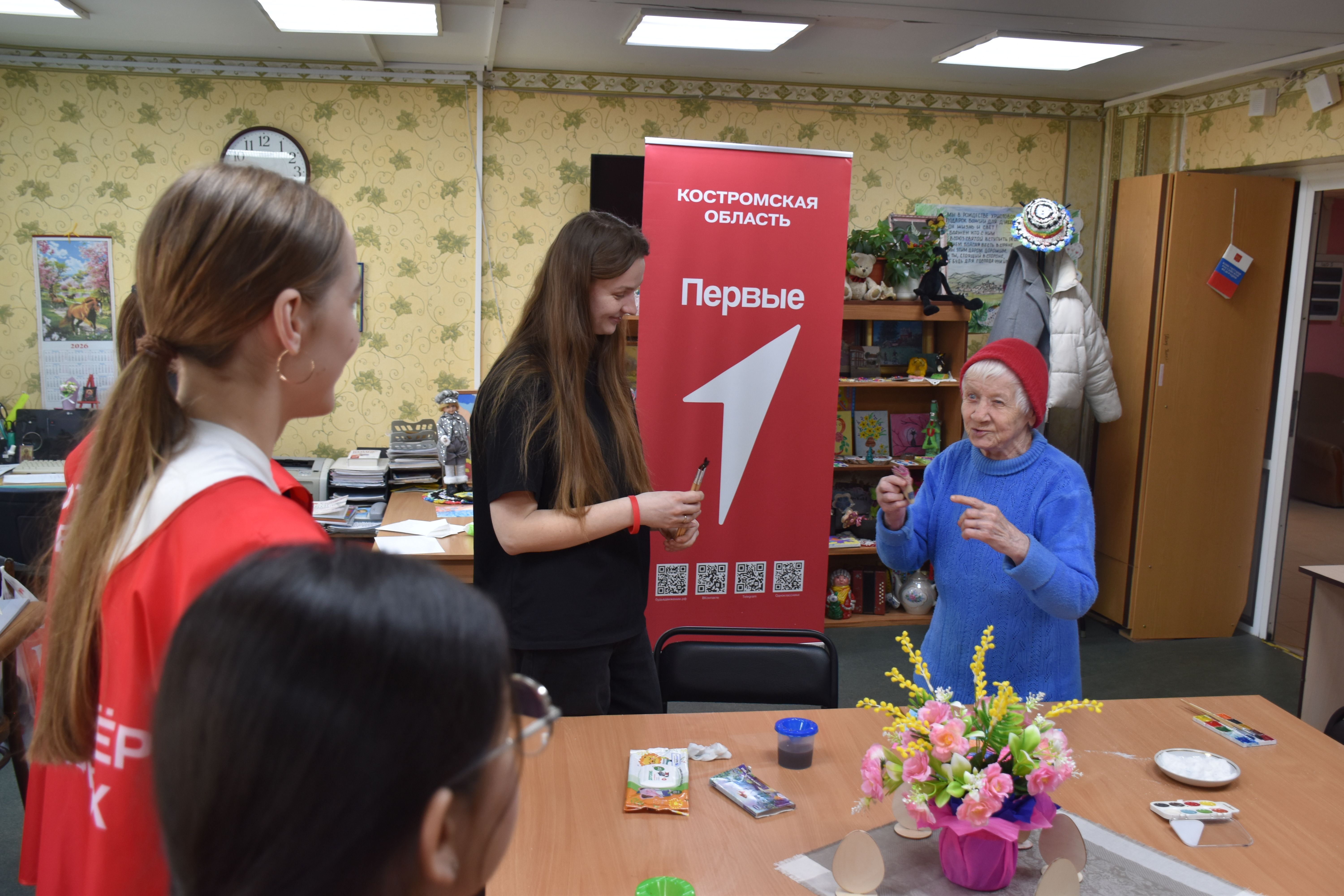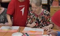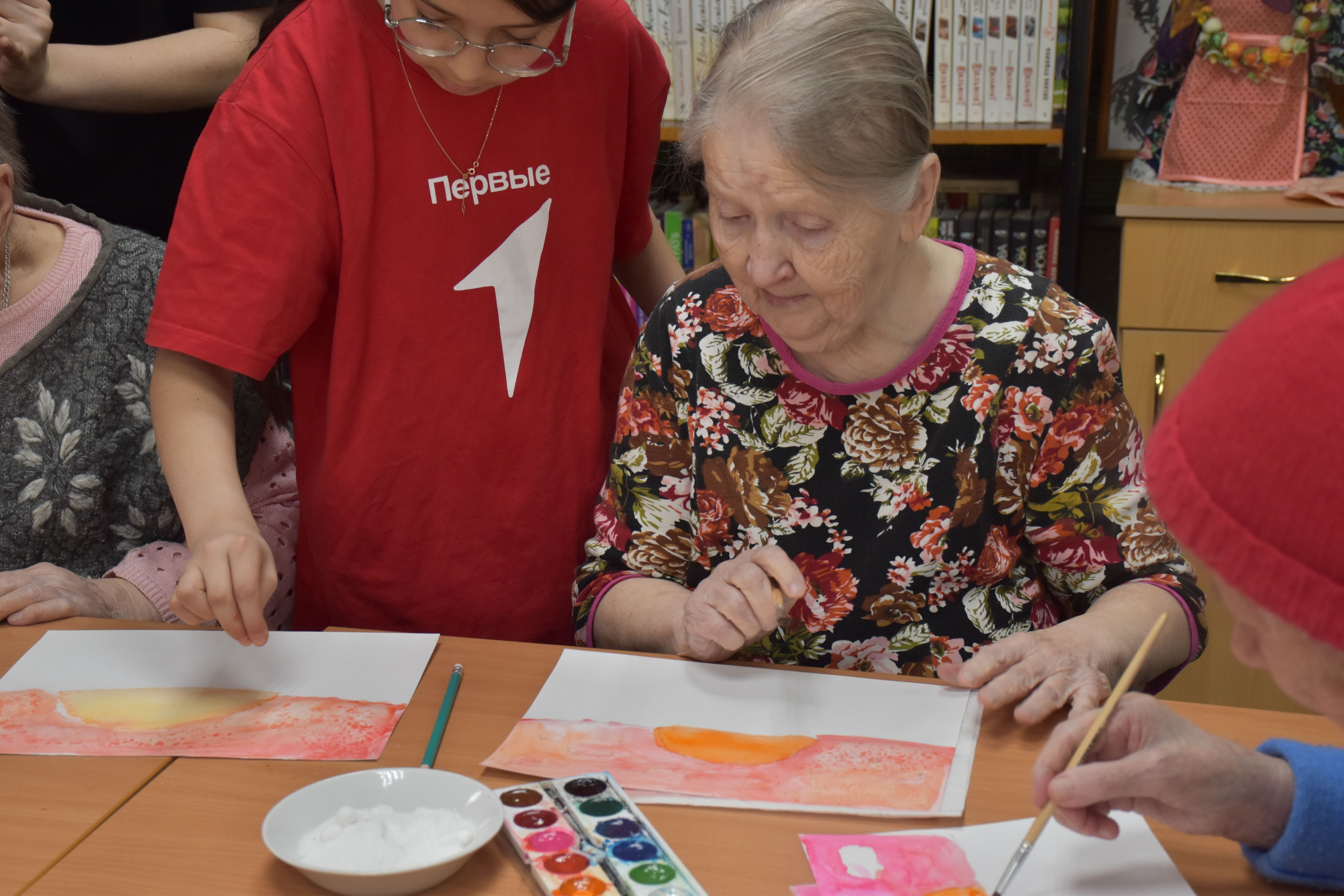 Заключительным творческим аккордом вторника стал оригинальный мастер-класс по написанию картин акварелью с использованием соли, который провели для проживающих Октябрьского геронтологического центра представители Движения Первых из 5-й костромской школы под руководством педагога Кристины Эдуардовны Смирновой.