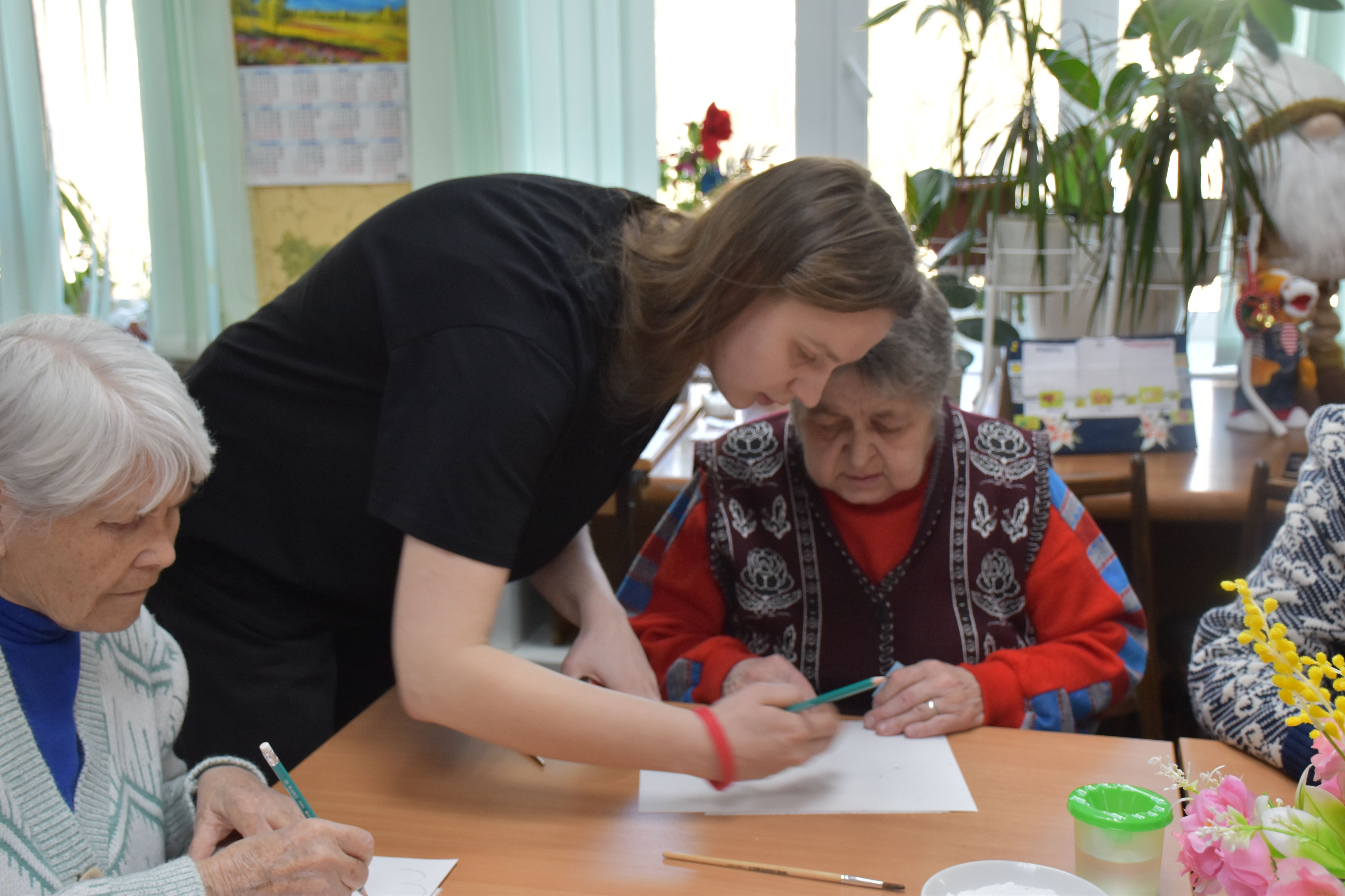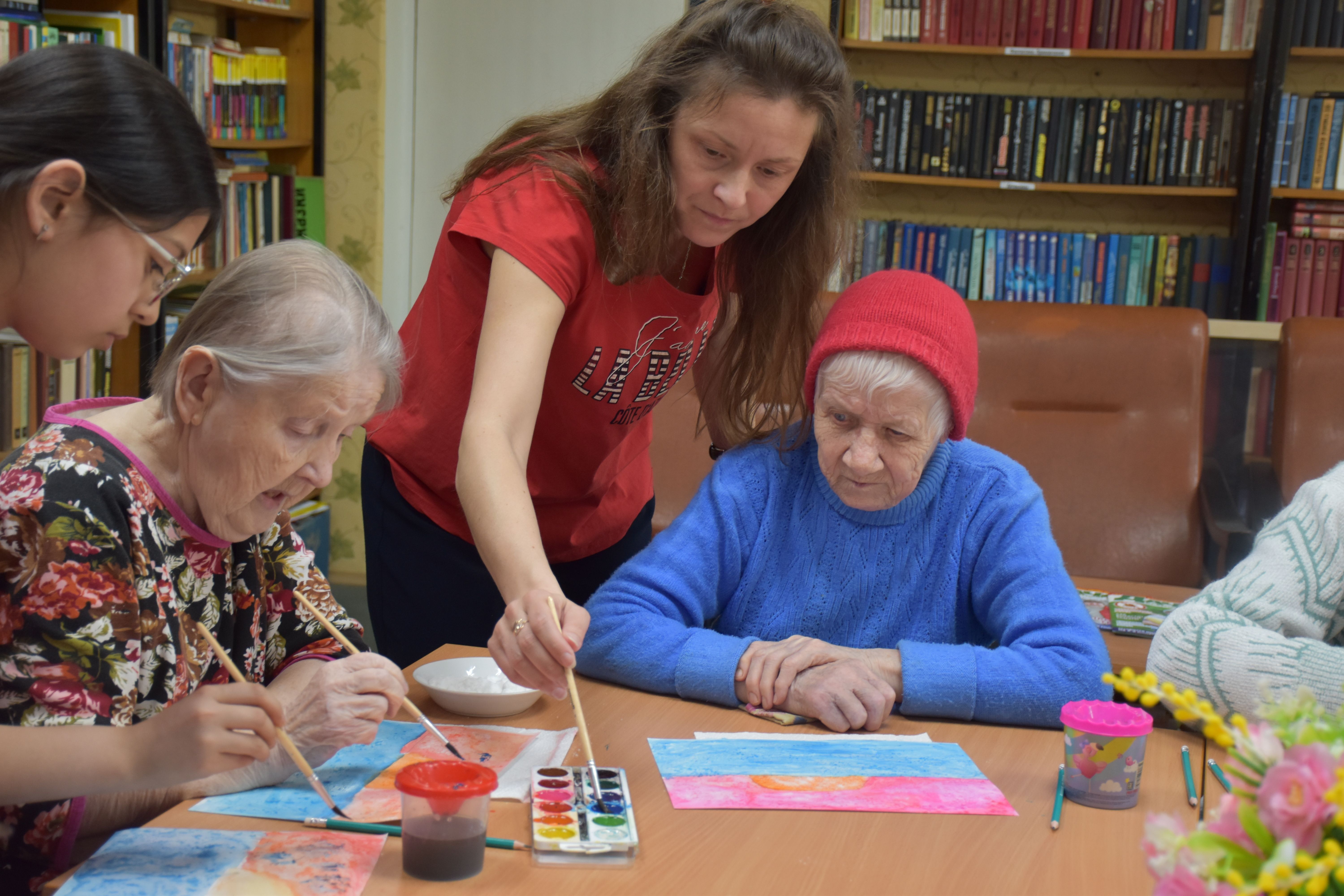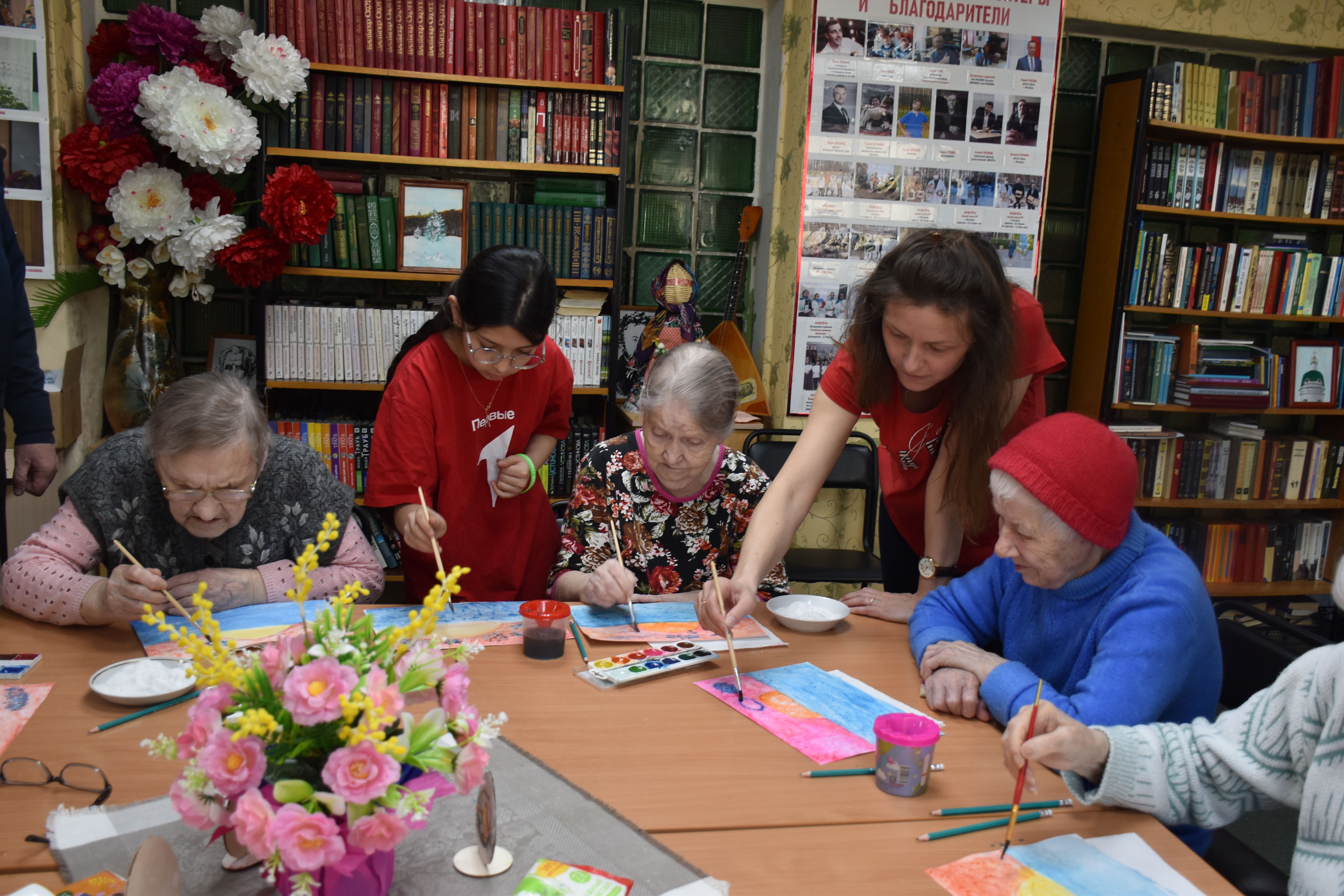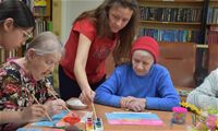 Заключительным творческим аккордом вторника стал оригинальный мастер-класс по написанию картин акварелью с использованием соли, который провели для проживающих Октябрьского геронтологического центра представители Движения Первых из 5-й костромской школы под руководством педагога Кристины Эдуардовны Смирновой.
