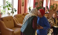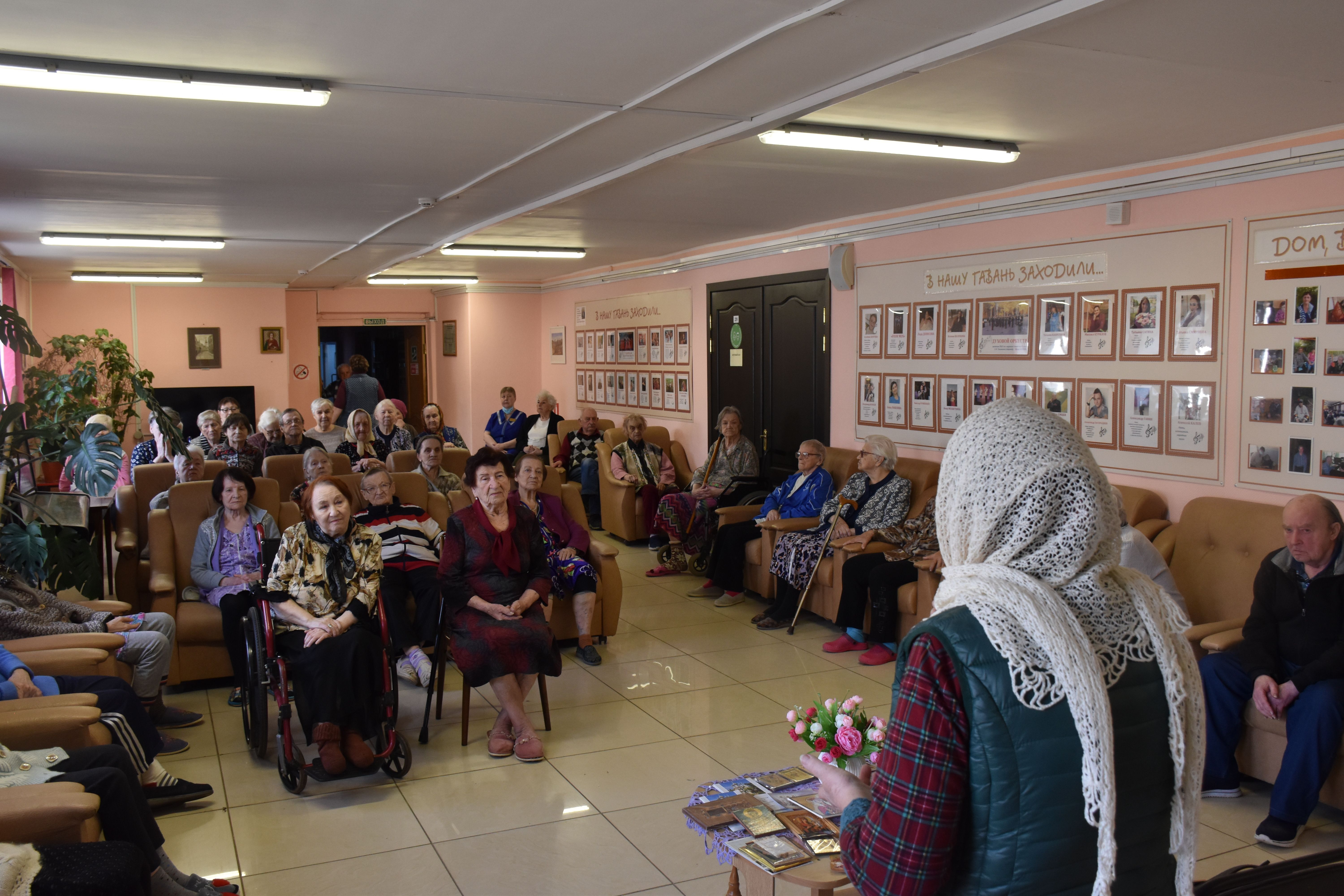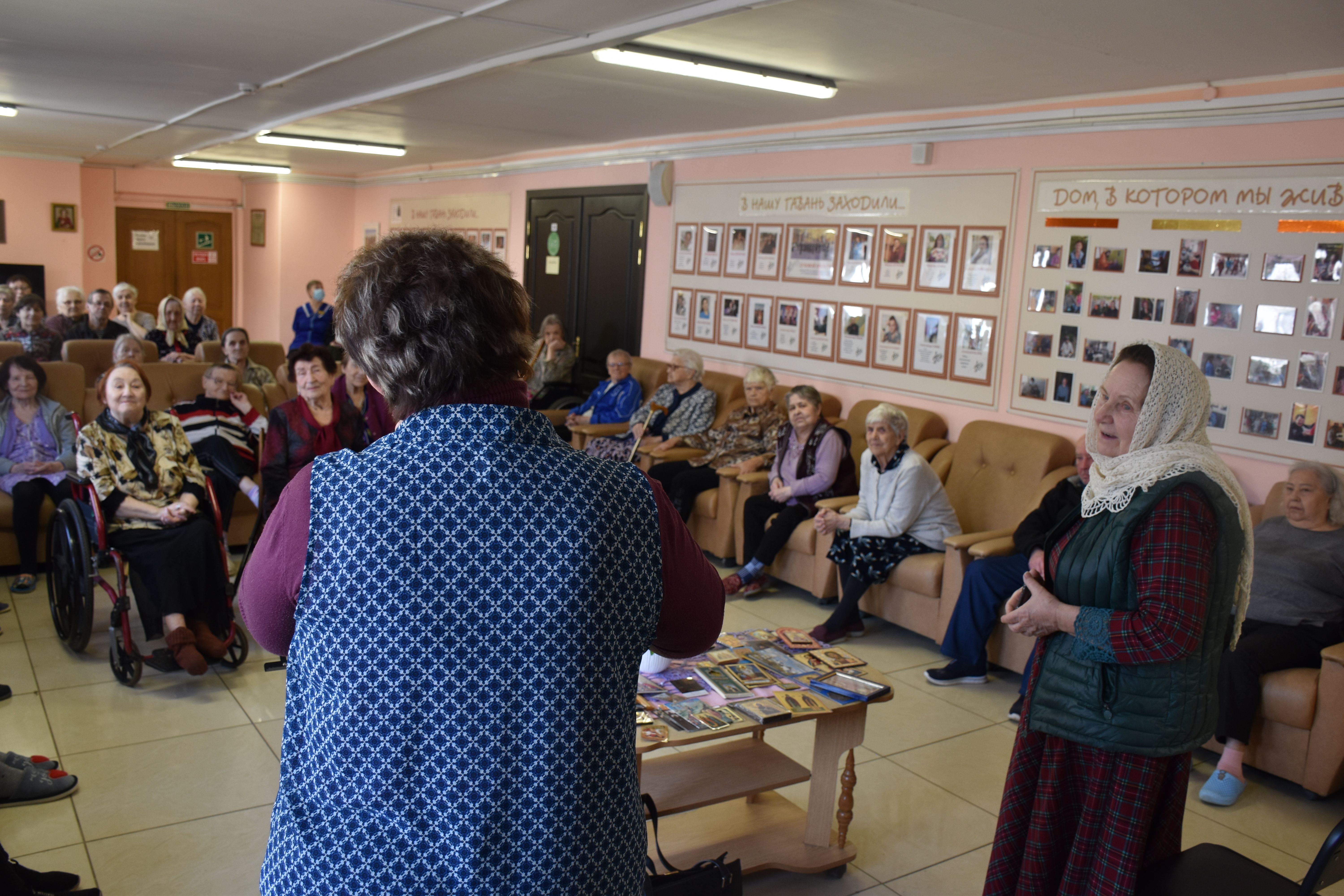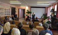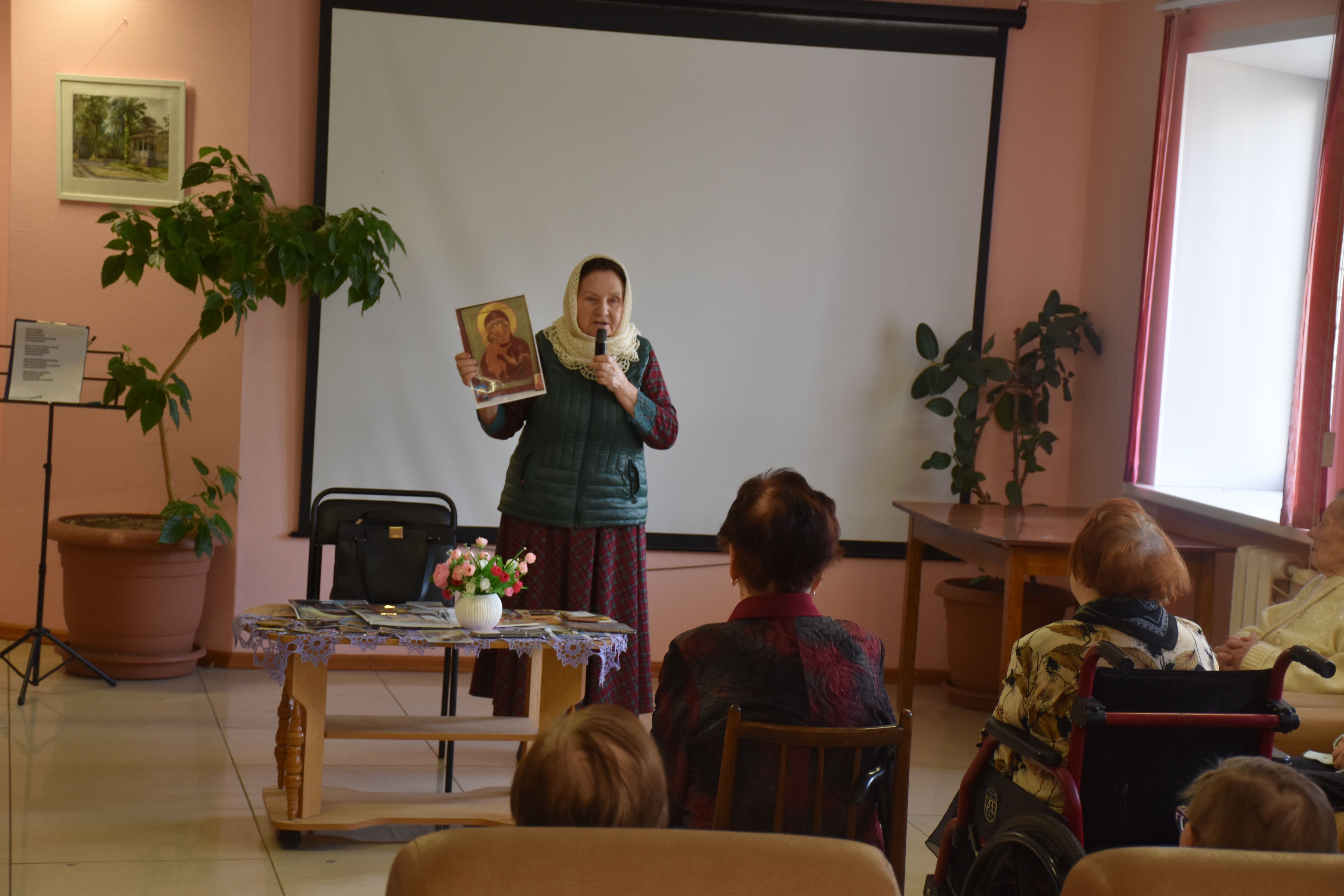 Гостья рассказала собравшимся в театральном фойе учреждения об особенностях иконописи, о том, почему существует так много иконописных изображений Божией Матери, и о том, как и почему она сама стала иконописцем. Гостья показала свои работы (и воочию, и на фотографиях, так как многие из написанных ею 13 икон достаточно большие по размерам). Разговор получился очень светлым, добрым и душеспасительным. Людмила Петровна пришла на встречу не с пустыми руками: каждый из присутствующих получил на память принесённую ею в дар небольшую икону, а культорганизатор центра Зоя Ростиславовна Кольцова дополнила рассказ гостьи несколькими песнями, в числе которых была и песня на стихи протоиерея Андрея Логвинова, которого наши проживающие и наша гостья знают лично. По окончании общей встречи её участники имели возможность лично побеседовать с Людмилой Петровной, задать ей интересующие их вопросы и поблагодарить за столь важный и интересный разговор.